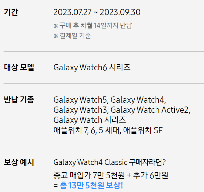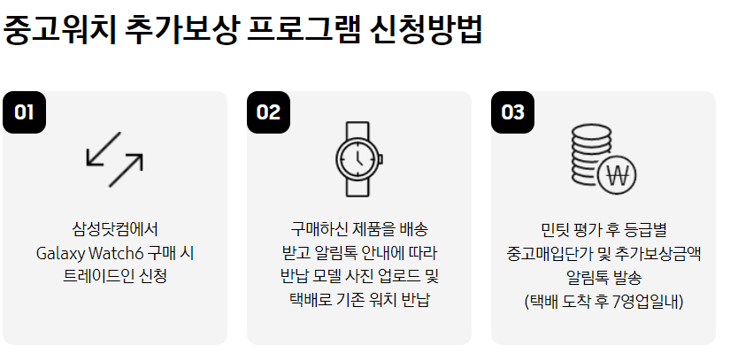 삼성닷컴에서 구매할 때 중고보상프로그램을 활용하면 최대 6만 원 추가 보상을 받으실 수 있는데요, 기존에 사용하시던 워치가 있어 기변을 생각하시는 분은 중고보상 프로그램으로 추가할인 꼭 받아가시기 바랍니다.