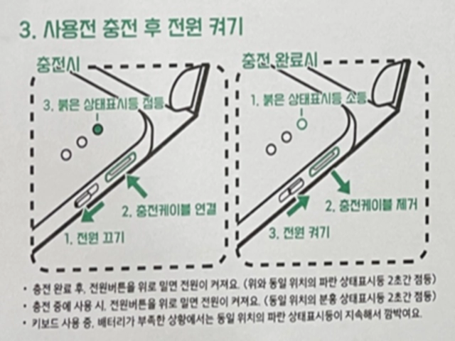3) 키보드도 따로 충전이 필요하다(완충시 100일 이상, 연속사용 시 80일 이상 이용가능하여 문제없음)