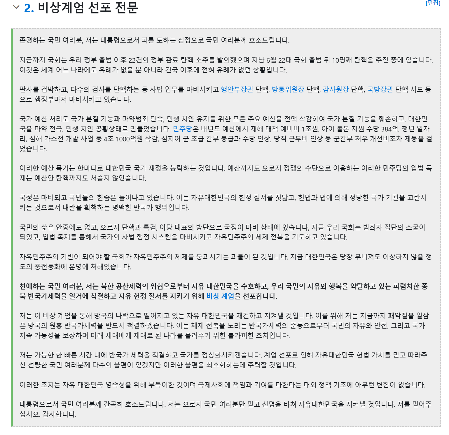계엄내용으로는 민주당의 예산삭감 및 각종 주요직위들 탄핵을 이유로 선포했다고 하였습니다