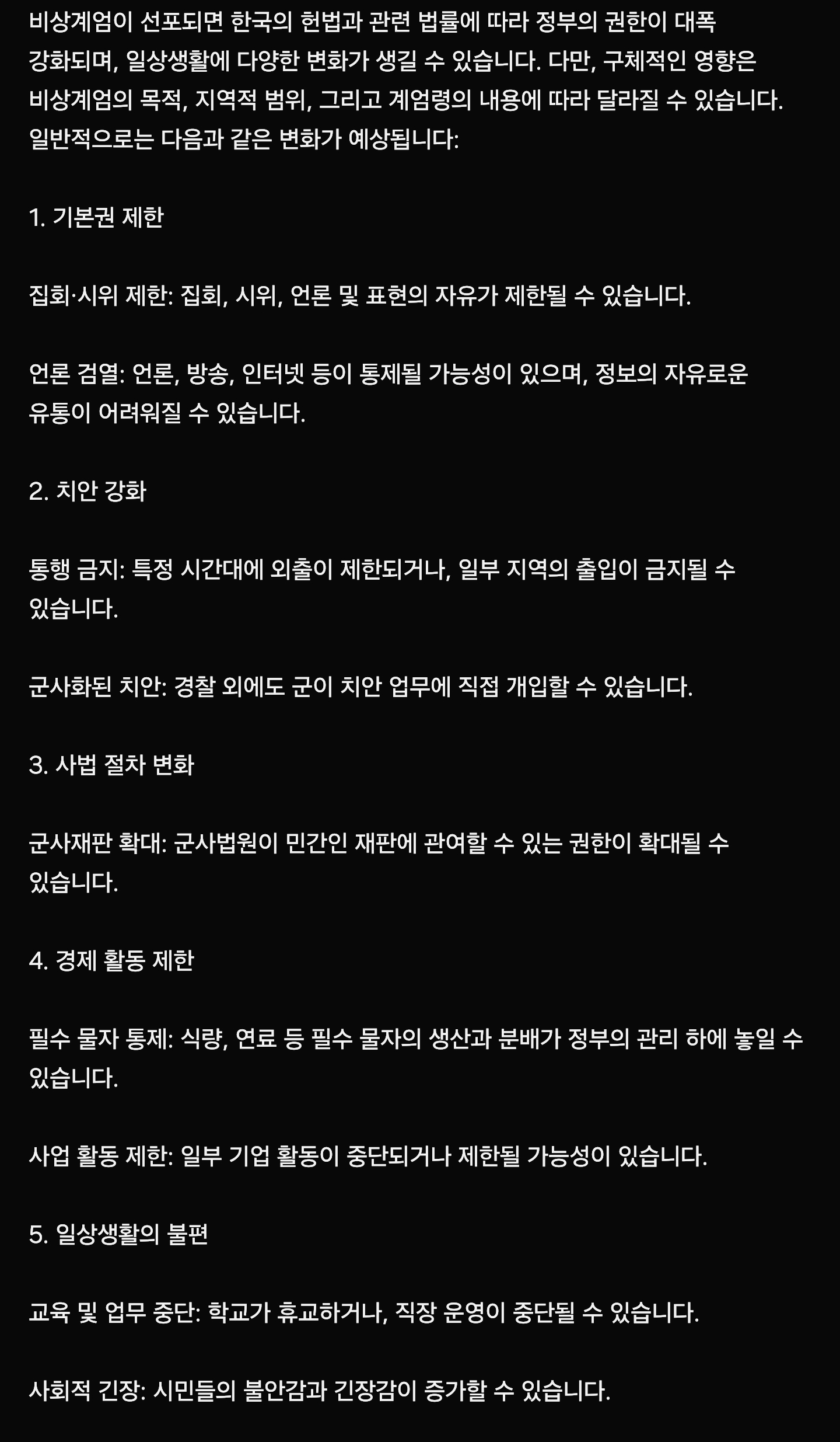 비상계엄령이 선포되면 한국의 헌법과 관련 법률에 따라 정부의 권한이 대폭 강화되며, 일상생활에 다양한 변화가 생길 수 있습니다. 다만, 구체적인 영향은 비상계엄의 목적, 지역적범위, 그리고 계엄령의 내용에 따라 달라질 수 있습니다.