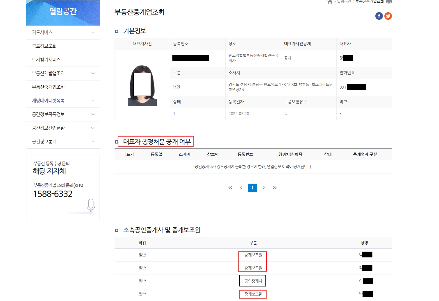 2. 규모가 큰 공인중개사 사무소에 경우 중개보조원이 상당히 많이 등록되어 있는 경우가 있습니다. 규모가 큰 사무사일 경우 꼭 중개보조원 조회가 필요합니다