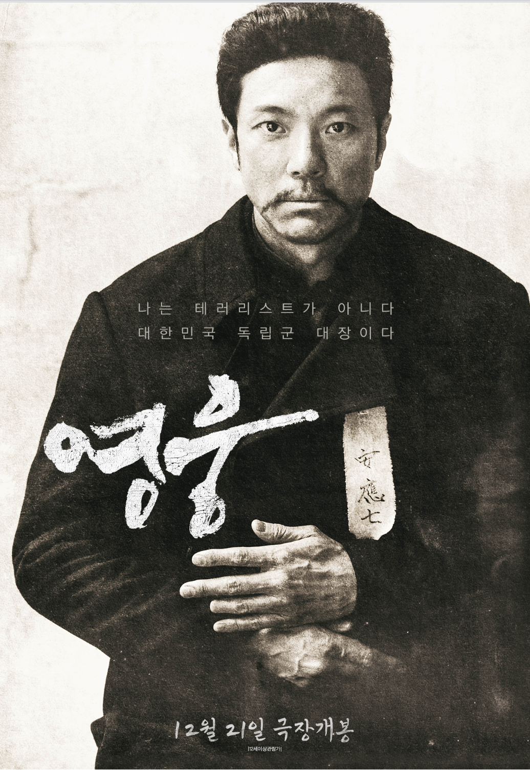 영화 영웅은 뮤지컬 <영웅>을 영화로 옮긴 작품입니다. 안중근 의사의 독립운동과 거사에 대해서는 대부분 사람들이 아는 이야기입니다. 뮤지컬로 제작되어 14년간 안중근 역할로 연기해온 정성화 배우님이 출현하여 같은 역할로 연기를 하신다고 하여 기대가 되었습니다. 이 영화는 사람들에게 생소한 뮤지컬 영화라는 장르로 만들어진 작품이라 더욱 궁금한 상태로 영화를 감상하였습니다. 포스터를 보면 더욱 놀랄 수밖에 없습니다. 교과서에서 보았던 안중근 의사의 실제 모습과 비슷하게 연출하였습니다. 이 역할을 하기 위해 14kg를 감량하고 촬영했다고 합니다.