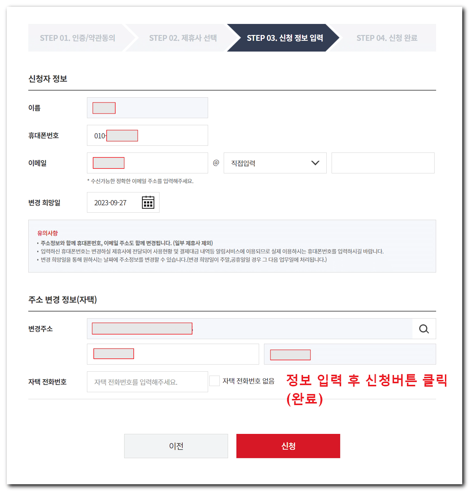 7. 신청자 정보 및 변경주소 확인 후 최종 신청