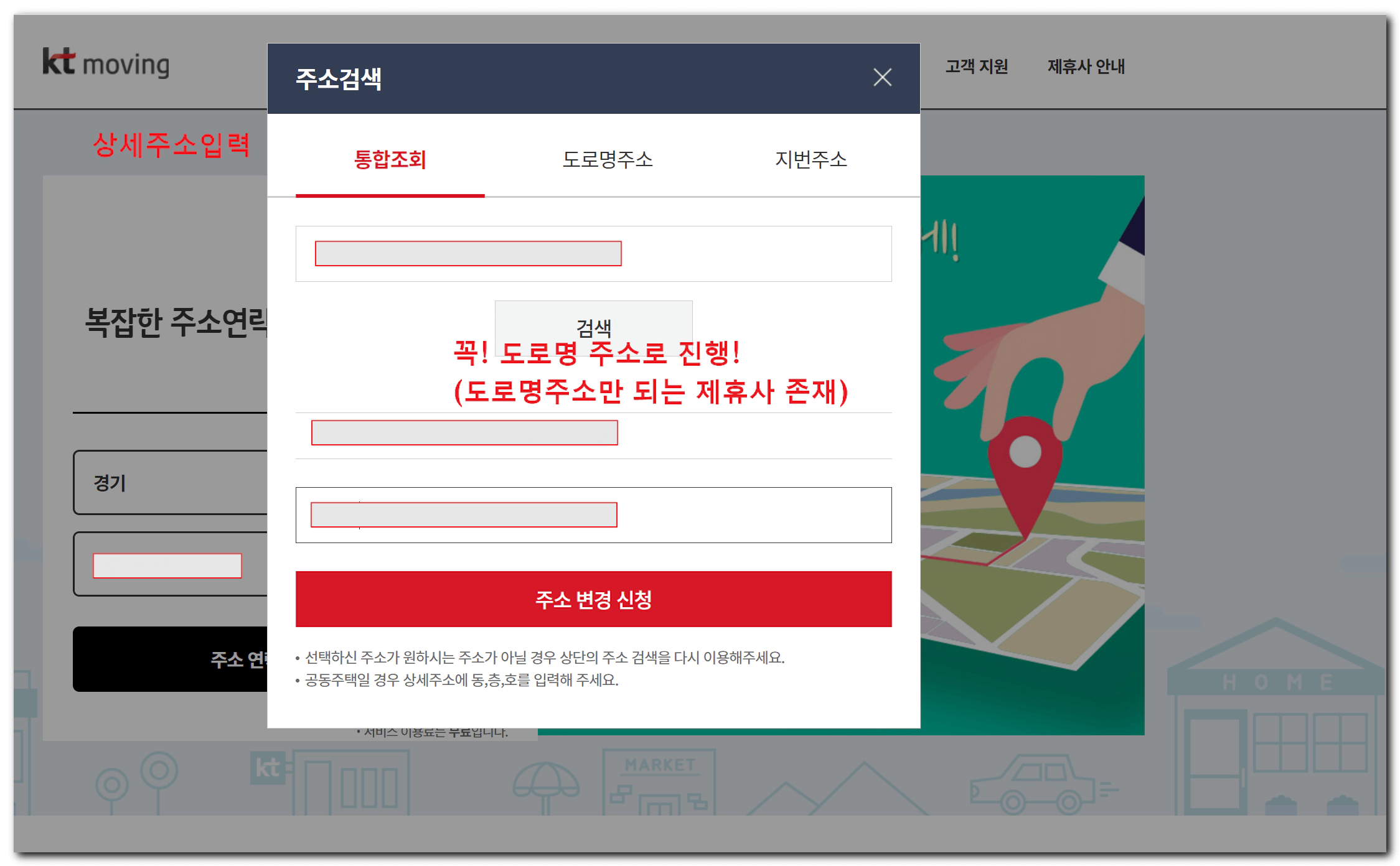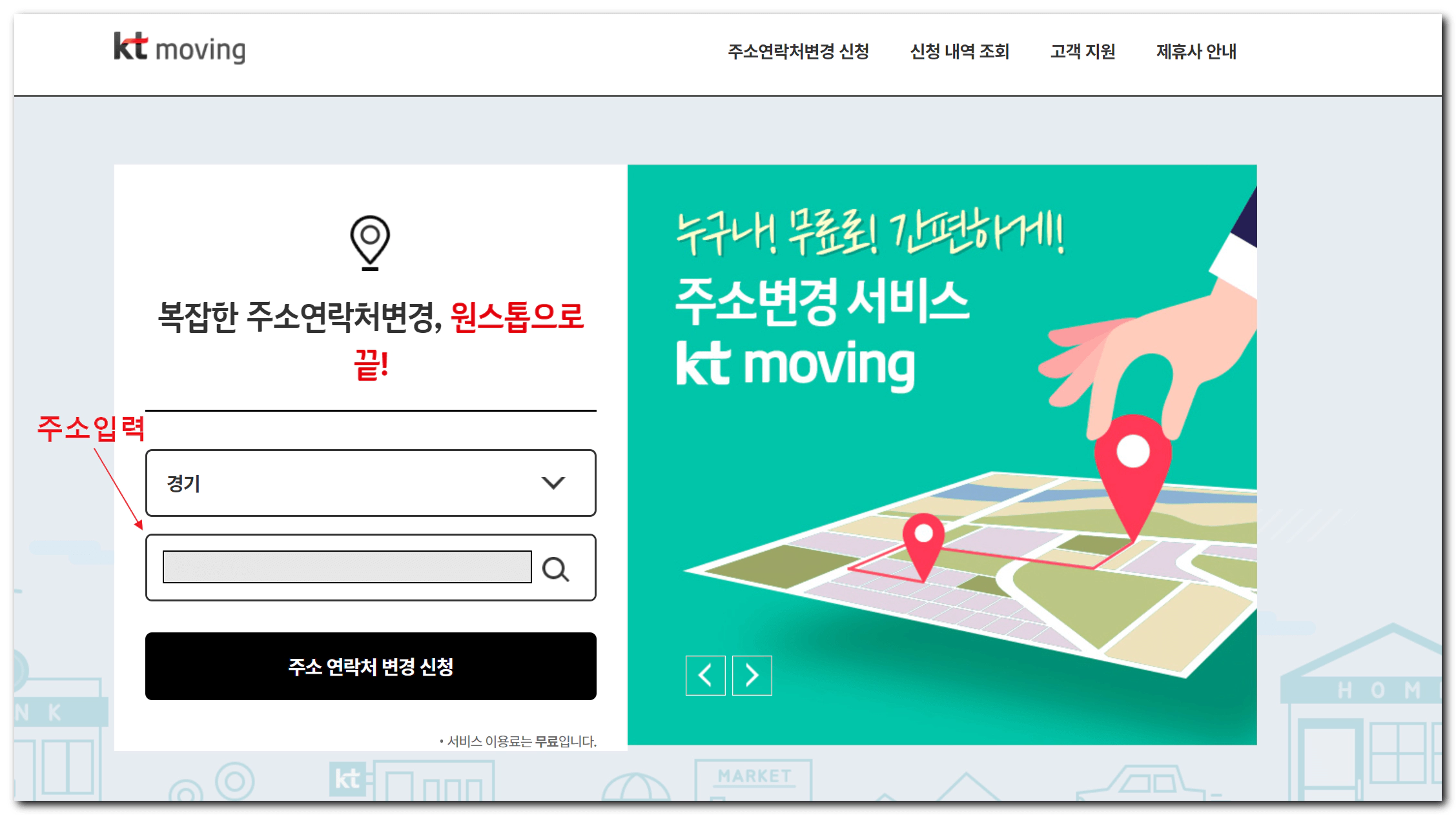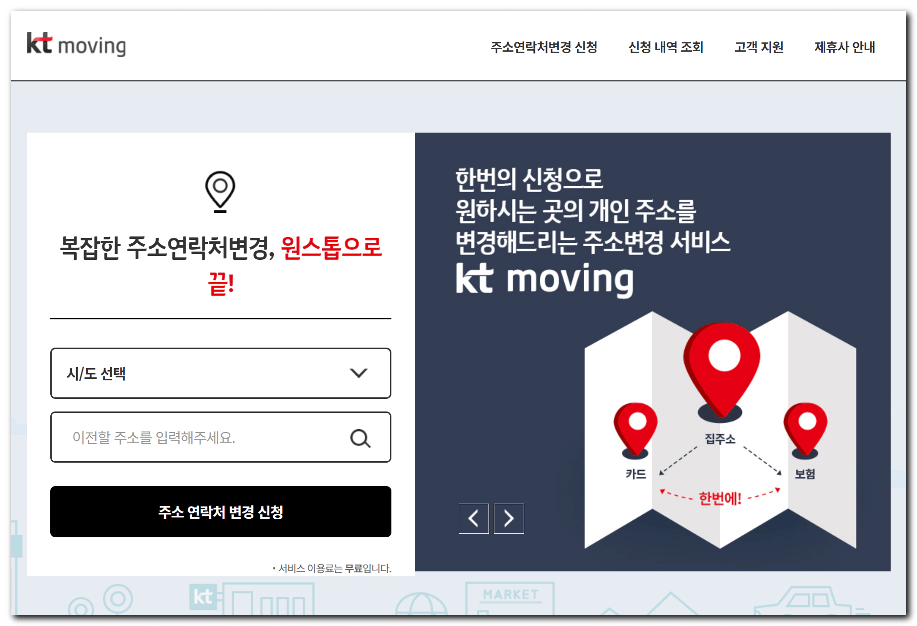 이사, 이직으로 인한 은행,카드,보험등 번거로운 주소변경 무료로 한번에 변경하세요. ktmoving 주소변경서비스는 누구나 무료로 간편하게 한번의 신청으로 원하시는 곳의 주소를 변경해 드립니
