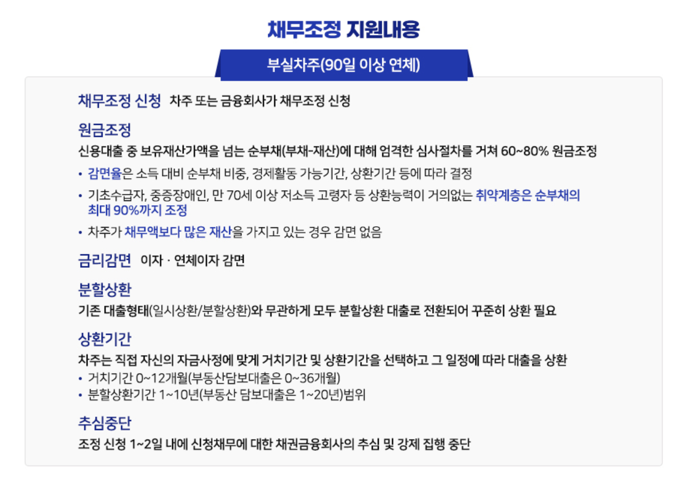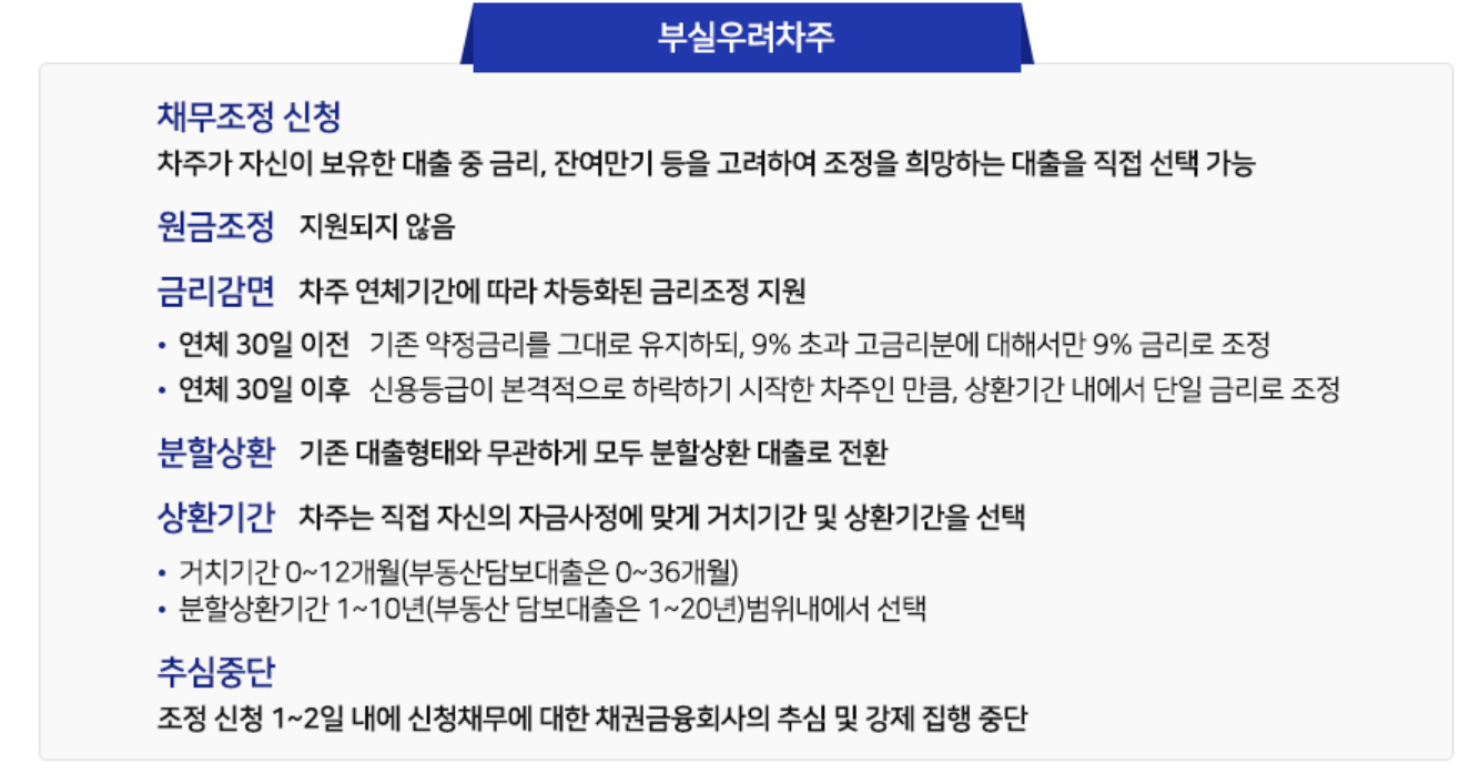 코로나 피해 개인사업자와 소상공인이 보유한 금융권 채무에 대해 상환능력 회복 속도에 맞추어 상환기간을 연장하고 금리와 원금을 감면하는등 채무에 대하여 도와주는 정부지원 정책입니다