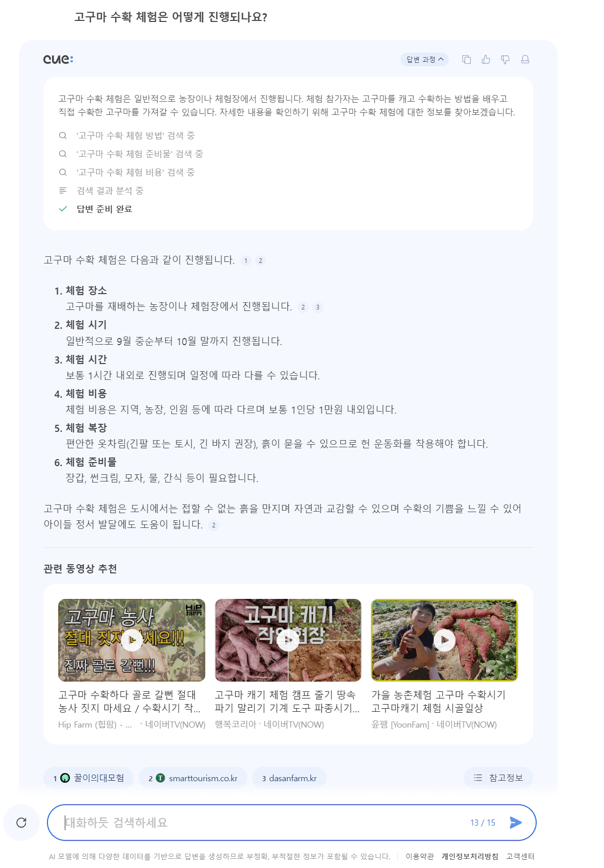 하지만, 이 답변은 조금 아쉬웠는데요, 저는 남원의 고구마 체험이 궁금하여 체험 방법을 질문하였는데요, 답변은 일반적인 고구마 체험방법에 대해서만 알려줬습니다. 남원의 고구마 체험의 내용은 결국 네이버에 따로 검색하여 알아보았습니다. 이 부분은 Chat-GPT보다는 약간 아쉬는 성능을 보여주었습니다